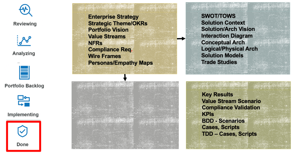 I will highlight the Done State for the Epic – the Lean-Agile Artifacts are Closed and have been removed as they are no longer relevant. The Enterprise Specification, Design and Architecture and Verification/Validation artifacts representing the Current Solution Intent.