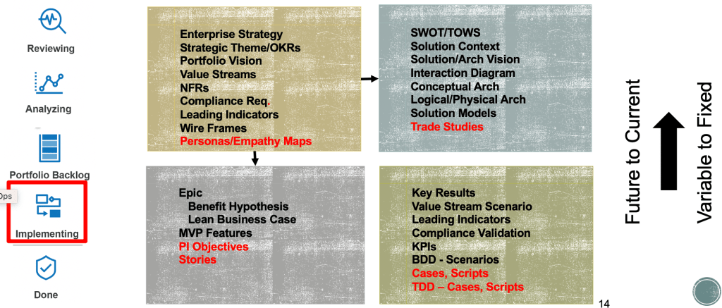 The following slide show demonstrates how artifacts are created and matured through the Portfolio Kanban stages of a SINGLE EPIC resulting in the movement from a Future State vision to a Current State that supports the Enterprise Strategy through Strategic Themes (OKRs.) This is a representative set of artifacts to communicate the process with the specifics to be determined for each Portfolio. A single enterprise may have different compliance requirements in each portfolio which would drive differences in each Solution Intent.